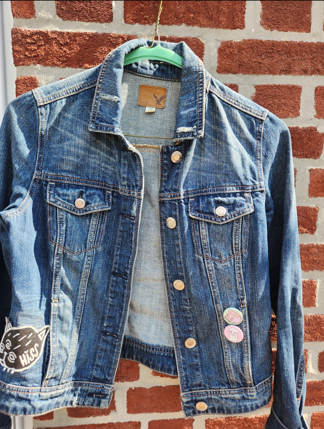 This is a well worn denim jacket, upcycled from a thrift store. The back was painted using acrylic paint and paint marker. This jacket was worn (by me) for many years and is in great condition. The front of the jacket has a small handmade patch sewn onto the side, as well as two buttons located on the other side.